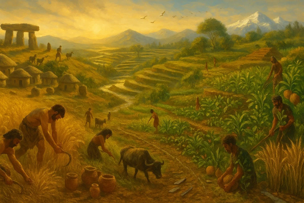 Hace unos 12 mil años, varios núcleos del planeta inventaron la agricultura de manera independiente. El Creciente Fértil domesticó trigo y cebada; China el mijo y el arroz; Nueva Guinea tubérculos; Mesoamérica el maíz; Andes la papa; África occidental el sorgo y el mijo perla. La sedentarización y el crecimiento poblacional empujaron migraciones de agricultores que reemplazaron o se mezclaron con cazadores recolectores.